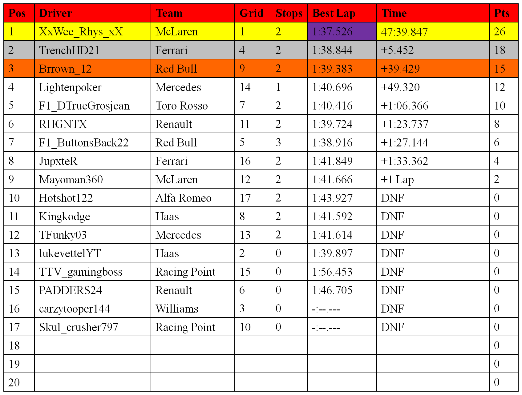 Lighteningpoker wins this award for having super race pace and cutting down the gap between himself and XxWee_Rhys_xX in the last 5 laps to finally overtake him and earn another podium finish.
