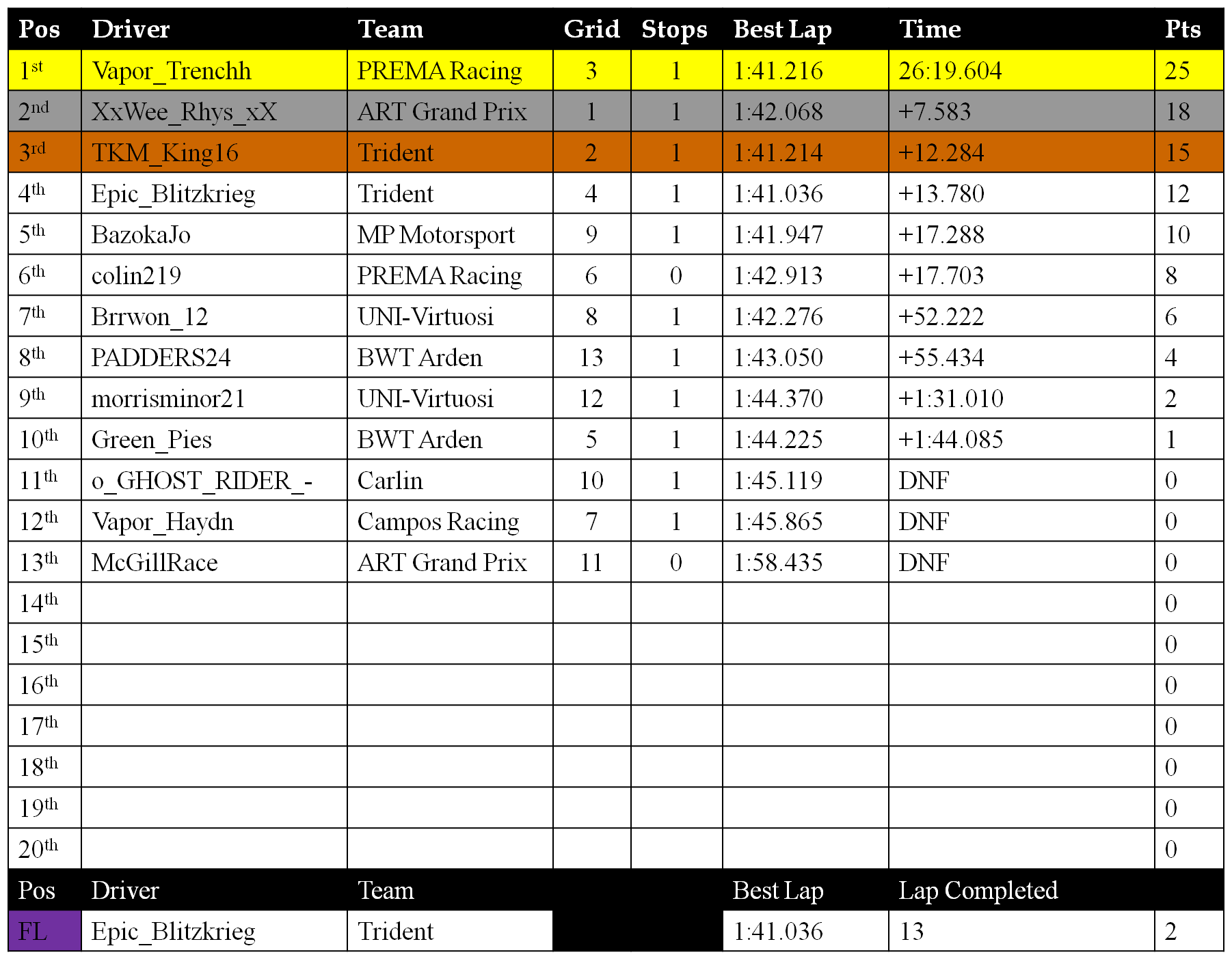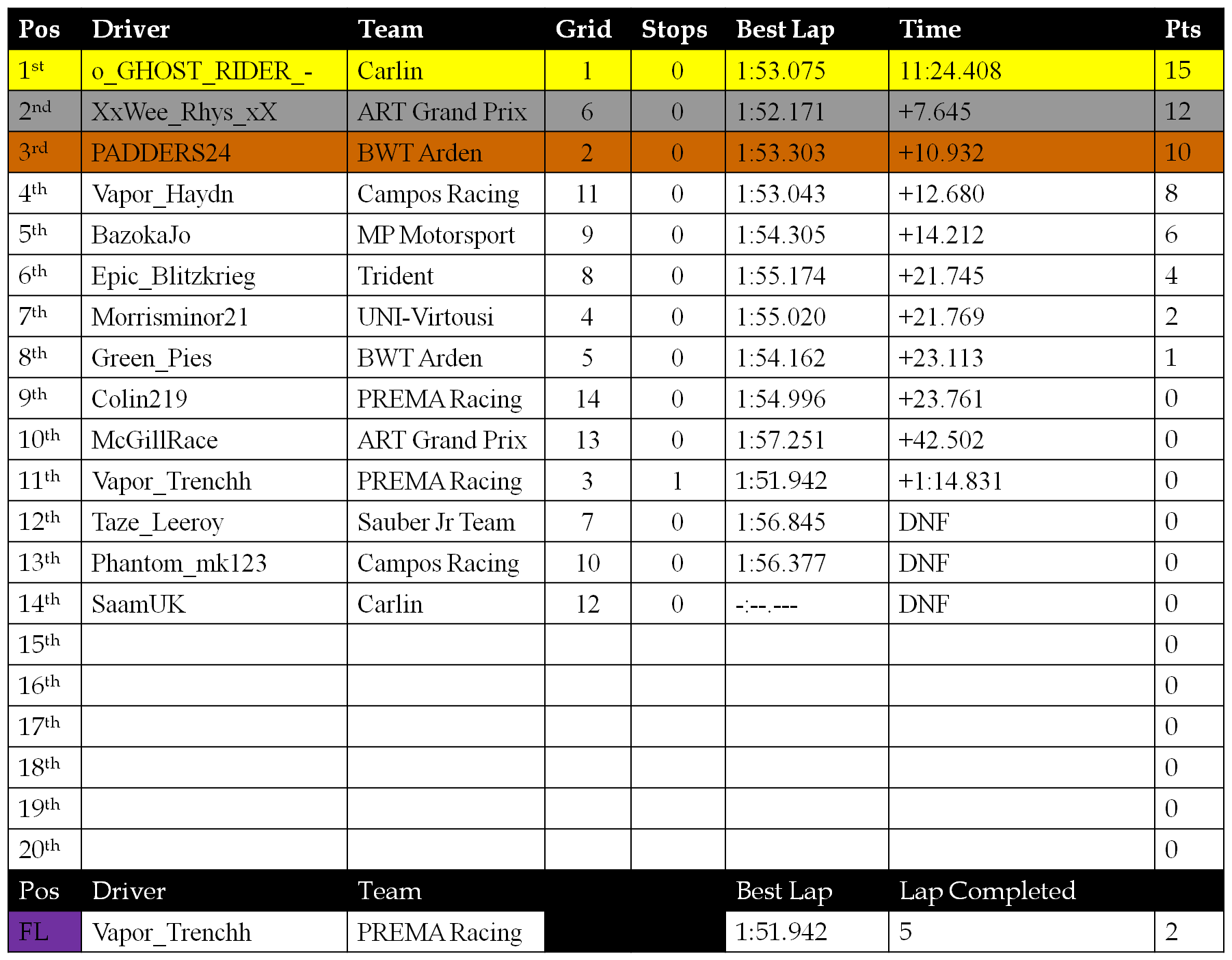 Vapor_Trenchh had 10 seconds removed from his time for unfair penalty.