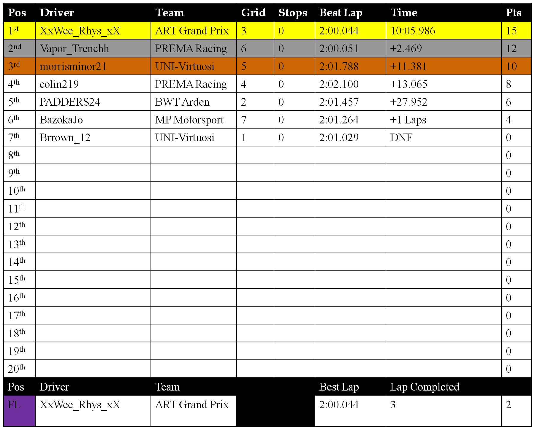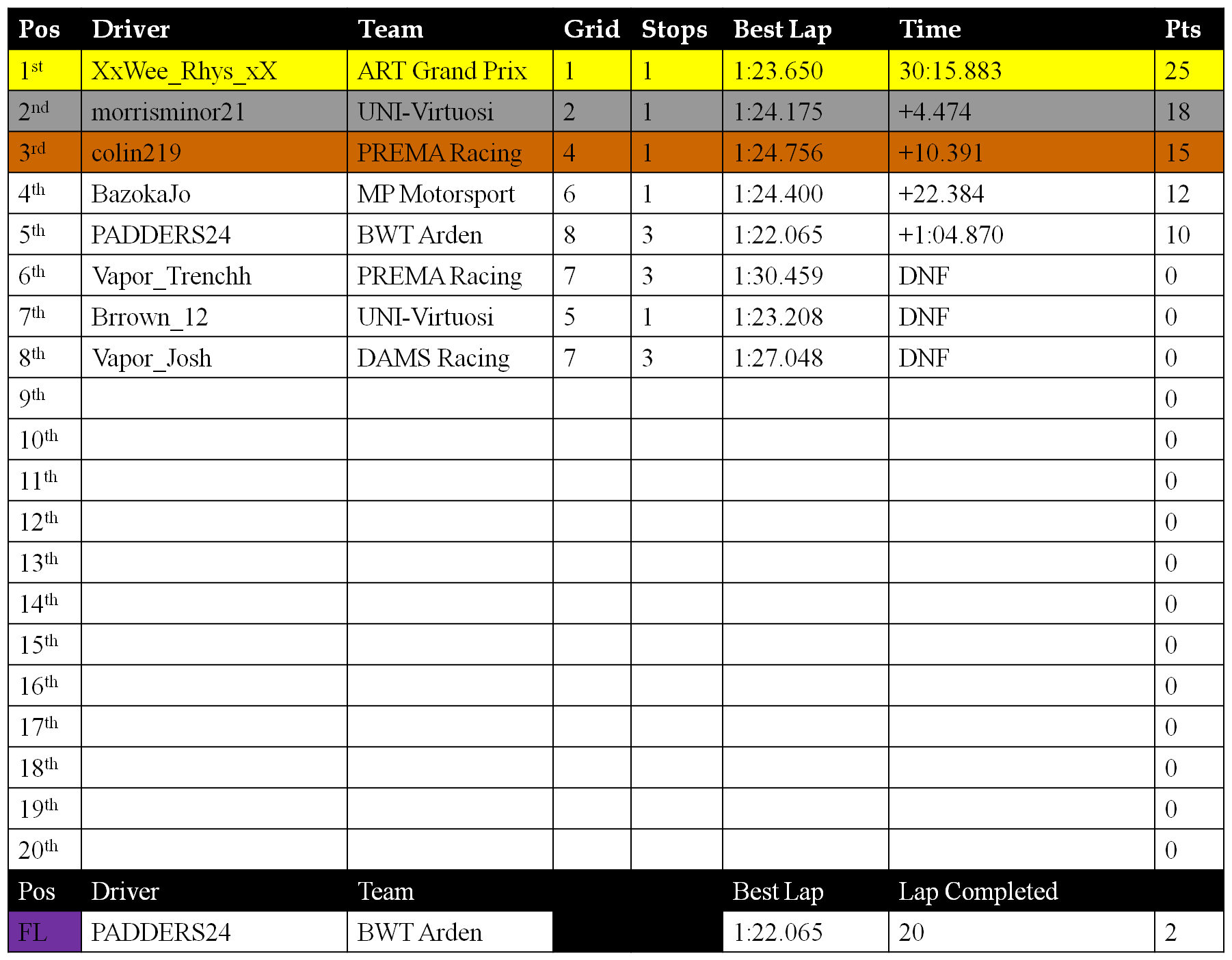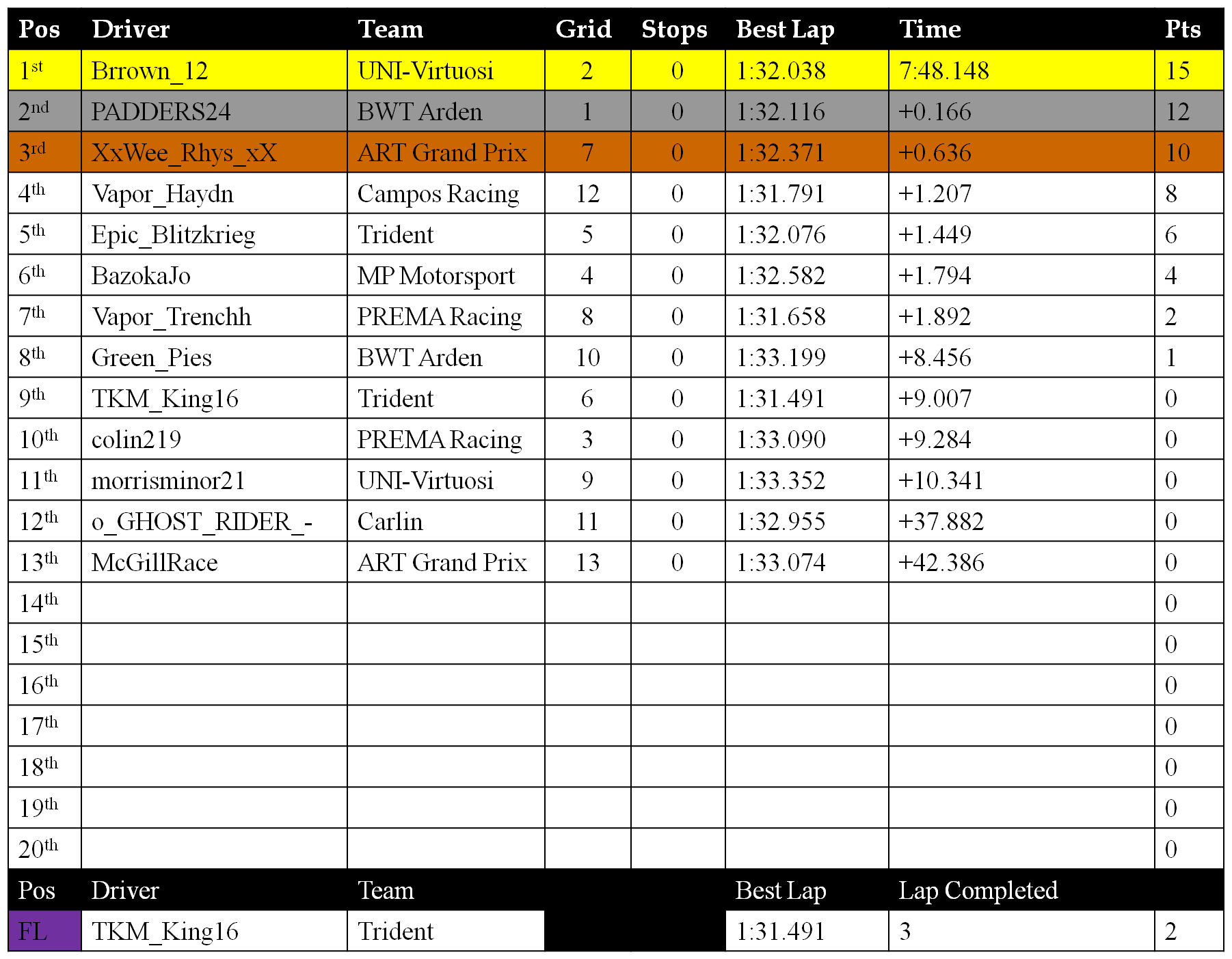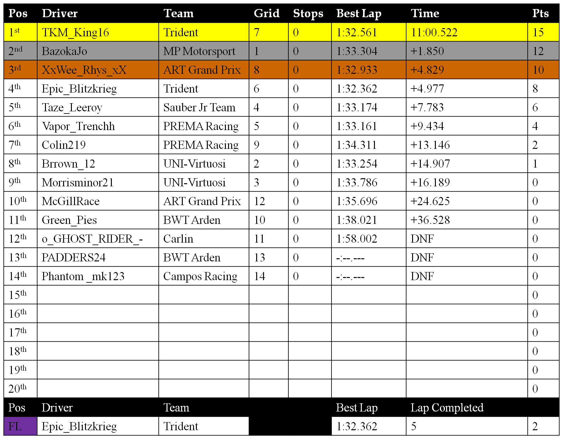 Taze_Leeroy has 3 seconds added to his time for cutting the final corner to get in front of WeeRhys, Moving him from P3-P5 in Race 2.