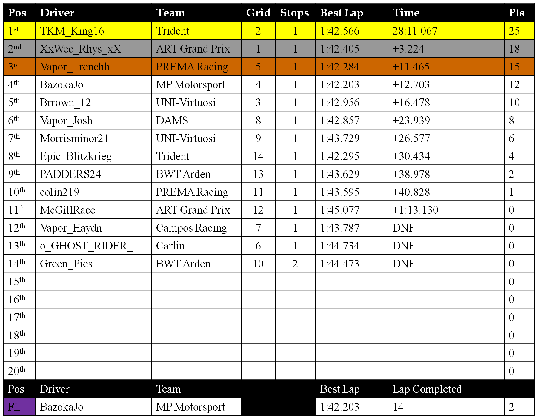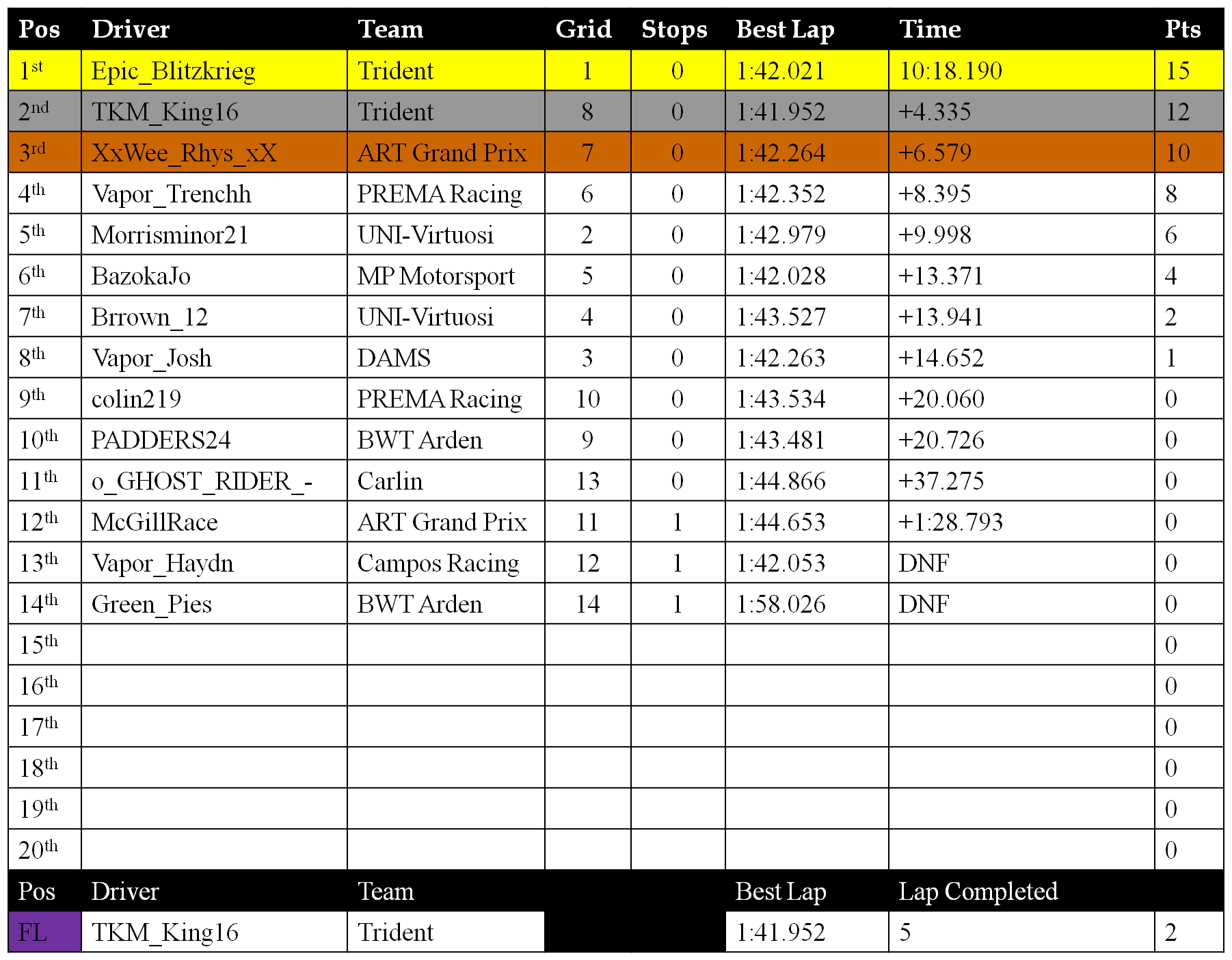 Results from Round 5, Belgium GP