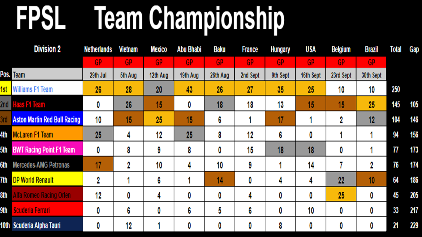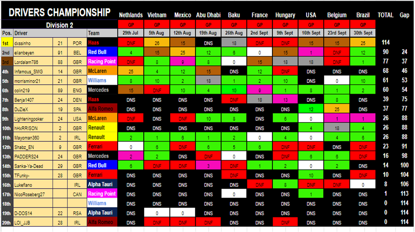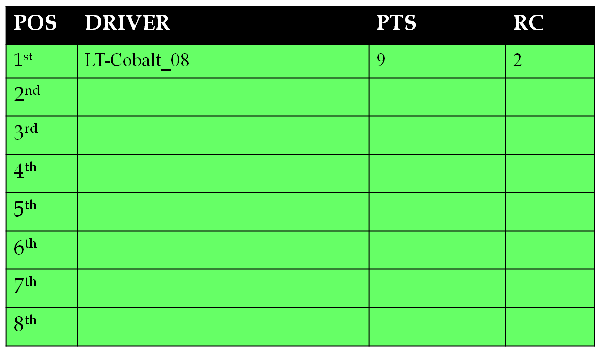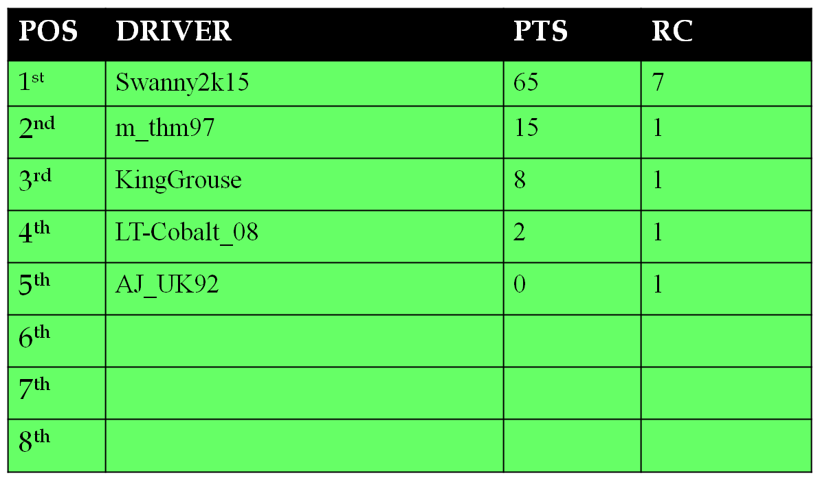 The 3 bottom drivers in Div1 at the end of the season will be relegated down to Div2 and the 3 top drivers from Div2 will be promoted to Div1, reserve dont count in the relegation or promotion . If a Div1 driver leaves mid season 1st place in Div2 will be asked if they want to step up to Div1 if they say no then 2nd will be asked...